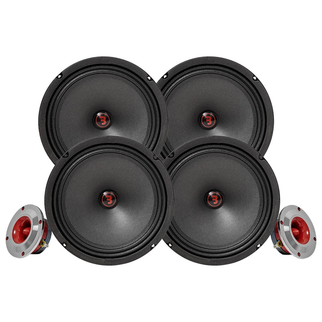 Fyra kraftfulla 8-tums midbasar kombineras med två horndiskanter för att ge dig ett högljutt, klart och prisvärt ljudsystem som tar bilen till nästa nivå.