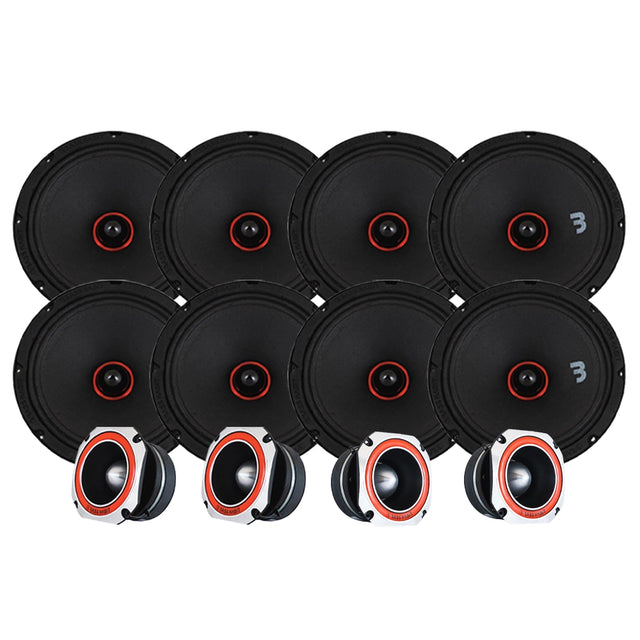 Med åtta 8-tums midbasar och fyra SE45T horndiskanter från den kompromisslösa SPL Elite-serien är detta ett paket byggt för tävling, show och maximal volym. Det här är SPL på riktigt – utan kompromisser.