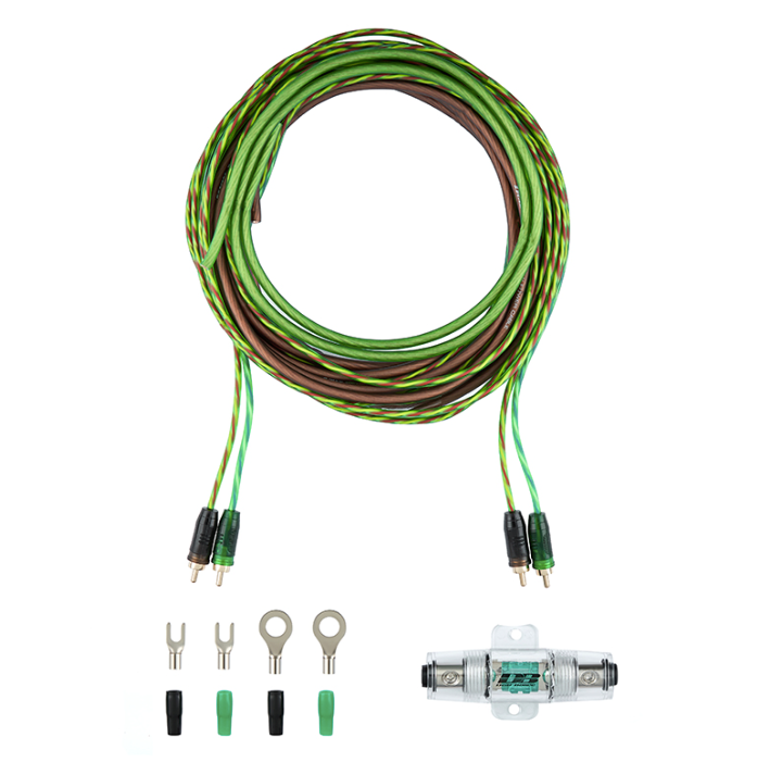 Ström- och jordkablarna är tillverkade av CCA (Copper Clad Aluminium) för god ledningsförmåga och låg vikt. Kablarna har kiselbaserad isolering, vilket gör dem flexibla och motståndskraftiga mot extrema temperaturer. Säkringshållaren är inkluderad för att skydda förstärkaren och elsystemet.