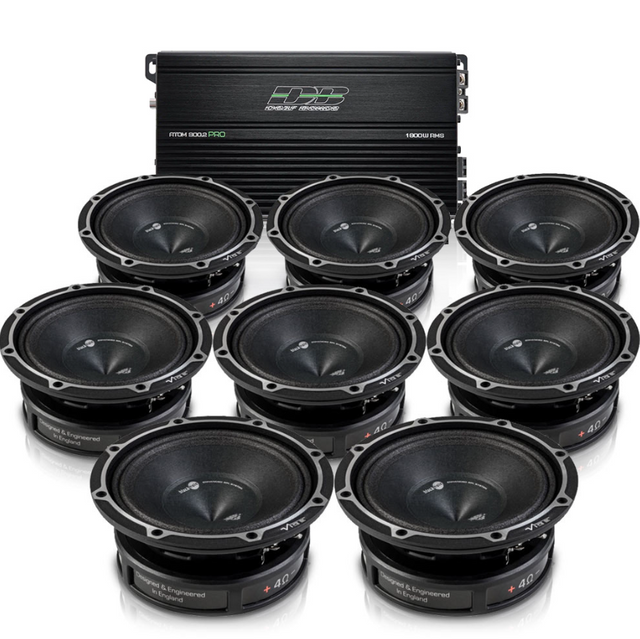 Detta system kombinerar Vibe Audios legendariska BlackDeath Pro 8M 8" midbasar med det extremt kraftfulla Deaf Bonce Atom 700.2 PRO-slutsteget – en kombination som är byggd för tävlingsklass och ljudbyggen på absolut toppnivå.