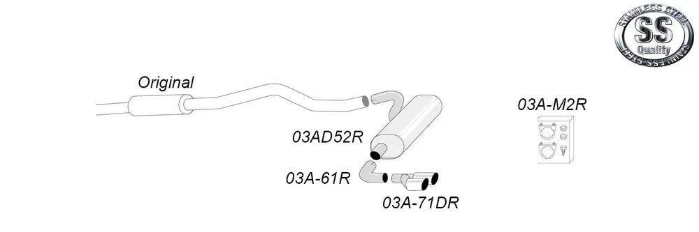 De dubbla ändrören på 80 mm ger bilen ett sportigare och mer kraftfullt utseende. För korrekt montering krävs dock att stötfångare eller diffusor bearbetas eller bytas ut.