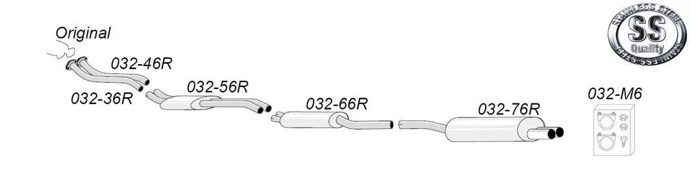 Detta kompletta avgassystem i rostfritt stål är särskilt framtaget för BMW E46 320i, 325i och 330i med M54-motorer på 2,2, 2,5 eller 3,0 liter. Det passar till karosstyperna Sedan, Touring, Coupé och Cabriolet tillverkade mellan 1999 och 2006. Systemet monteras efter katalysatorn och levereras som ett komplett kit som är anpassat för bilens originalupphängningar, vilket gör installationen smidig och problemfri.