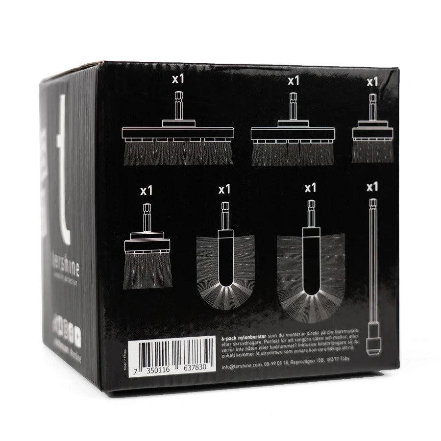 Tershine Borstar för skruvdragare – Hård är ett komplett set med sex stycken kraftiga nylonborstar utvecklade för tuff rengöring där vanliga borstar inte räcker till.