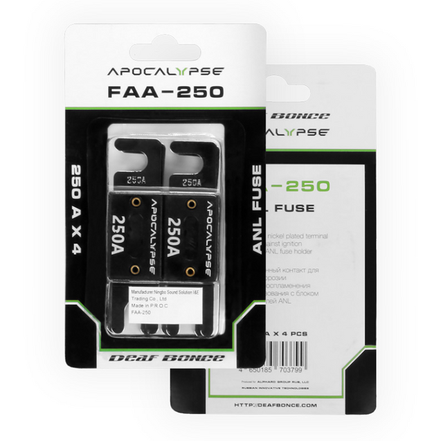 Deaf Bonce Apocalypse FAA-250 är ett 4-pack högströms ANL-säkringar på 250 ampere, utvecklade för krävande bilstereo- och SPL-installationer där stabil strömförsörjning och tillförlitligt skydd är avgörande.