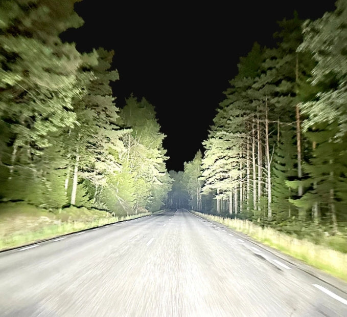 Bred och lång Driving Beam ljusbild ger utmärkt sikt på väg och vägren för säkrare mörkerkörning