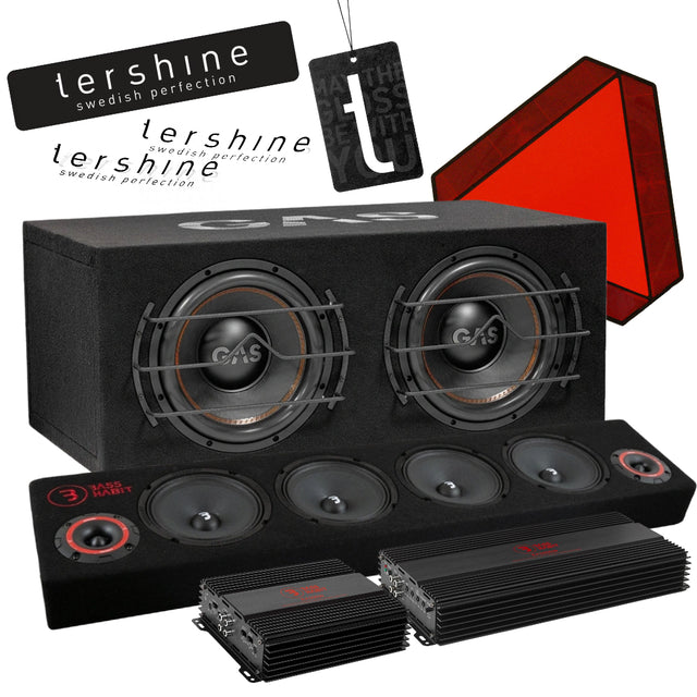 Ett komplett och kraftfullt ljudpaket för A-traktor, EPA och bil som kombinerar högt och klart mellanregister med djup och tryckande bas. Paketet innehåller den portade raggarplankan Bass Habit Play SPL64, det prisvärda 2-kanaliga slutsteget Bass Habit Rebel RA500W, den brutala dubbelbaslådan GAS MAX B1-212 samt monoblocket Bass Habit RA3600W.