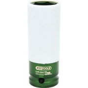 Denna krafthylsa från KS Tools är konstruerad för professionell användning vid arbete med aluminiumfälgar. Den långa modellen (85 mm) gör den särskilt lämplig för muttrar som sitter djupare, samtidigt som den sexkantiga profilen säkerställer ett säkert grepp och minskar risken för slitage på muttern. Den gröna färgmarkeringen gör det enkelt att snabbt identifiera rätt storlek bland verktygen.