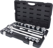 Robust och komplett 21-delars hylsnyckelsats från KS Tools med 3/4-tums drivning. Designad för tunga moment och användning inom industri, jordbruk, entreprenad och fordonsteknik. Satsen innehåller hylsor i storlekar upp till 50 mm och verktyg som är tillverkade i slitstarkt krom-vanadinstål för maximal hållbarhet.