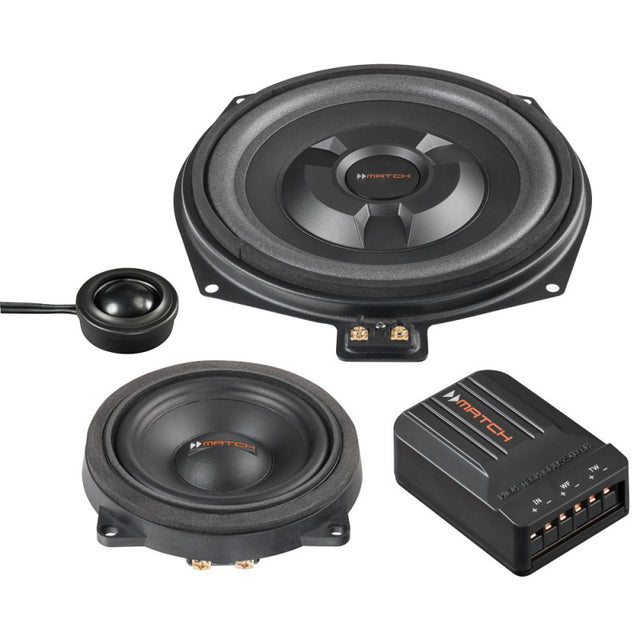 MATCH MS 83C-BMW.2 är ett komplett 3-vägs högtalarsystem utvecklat specifikt för BMW-modeller i 1-, 3-, 4- och 6-serien samt X3 och X4. Systemet ersätter bilens originalhögtalare med högpresterande 8" under-seat woofers, 4" midrange-element och 1" silk dome-diskanter – alla anpassade för montering i bilens originalpositioner.