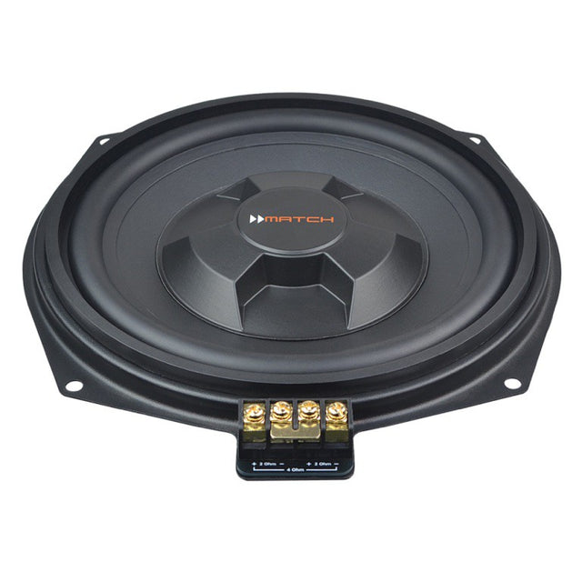 MATCH MW 8BMW-D är en bilspecifik 8-tums subwoofer avsedd för BMW-modeller med under-seat-monterade baskammare. Den är utvecklad för förare som vill förbättra basresponsen kraftigt utan att förändra bilens interiör eller originalutrustning. Subwoofern passar direkt i BMW:s originalfästen och levereras med två Plug & Play-kontakter för smidig installation.
