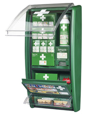 Väggmonterad Första Hjälpen-station med brett innehåll för att hantera olika typer av skador, från mindre sår till brännskador och ögonsköljning. Utrustningen är tydligt organiserad och lättillgänglig, vilket gör det enkelt att snabbt agera vid olyckor på arbetsplatsen. Stationen kan anpassas efter specifika vårdbehov och arbetsmiljöer.