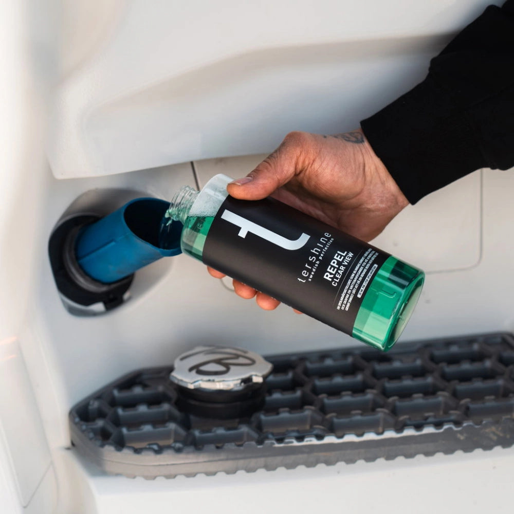 Tershine Repel Clear View är en effektiv och användarvänlig glasbehandling som blandas direkt i bilens spolarvätska. Produkten skapar en hydrofobisk yta på vindrutan vilket gör att vatten snabbt pärlar sig och blåser bort under körning. Resultatet är dramatiskt förbättrad sikt i regn, dimma och snö – utan att du behöver applicera något manuellt på glaset.