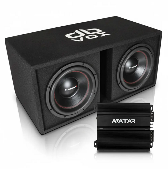 Detta paket kombinerar två Soundmax SX-FX12.D4 12-tums subwoofers, en robust portad dBVox-låda och Avatar ABR-800.1 monoförstärkare – ett komplett system byggt för tryck, kontroll och lång hållbarhet.