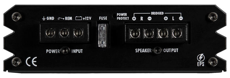 För anslutning finns RCA-ingångar och utgångar via wire harness samt högnivåingång med EPS (Enhanced Power Supply) för smidig koppling till fabriksstereo. Auto Turn On-funktionen gör att förstärkaren automatiskt slås på när den detekterar en ljudsignal.