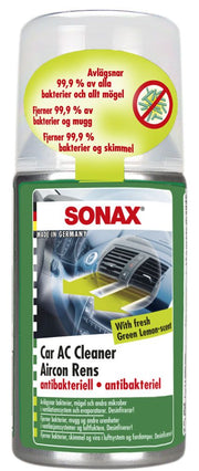 SONAX Car AC Cleaner Green Lemon är en kraftfull och snabbverkande rengöringsspray som eliminerar bakterier, mögel och andra mikroorganismer i bilens ventilationssystem och evaporator. Den antibakteriella formeln är utvecklad för att rengöra luftkonditioneringen på ett hygieniskt och effektivt sätt – direkt via kupén – och ger frisk och fräsch luft redan efter 10 minuter.